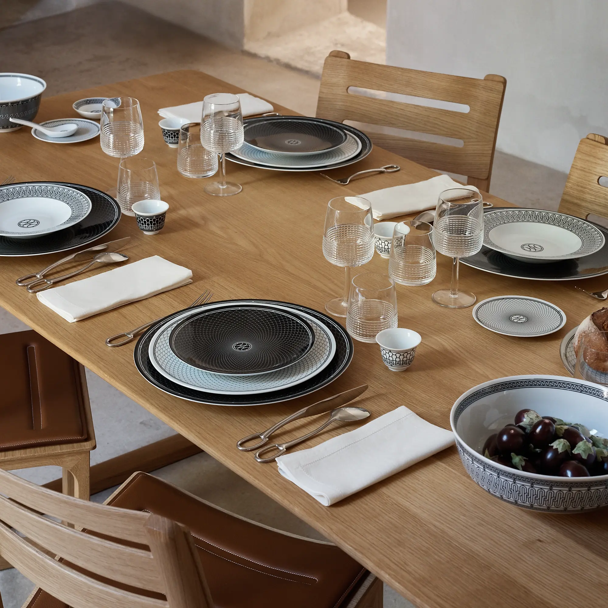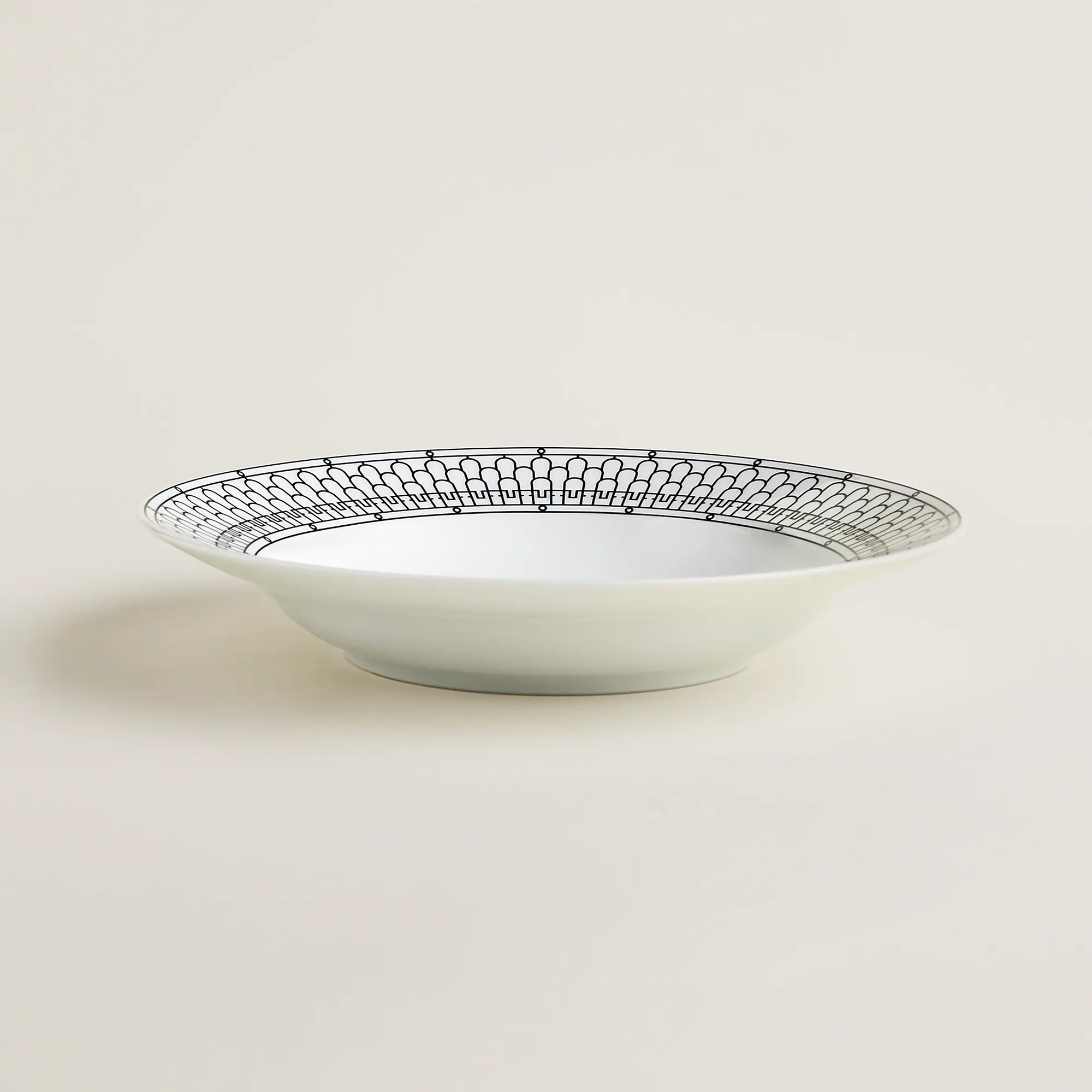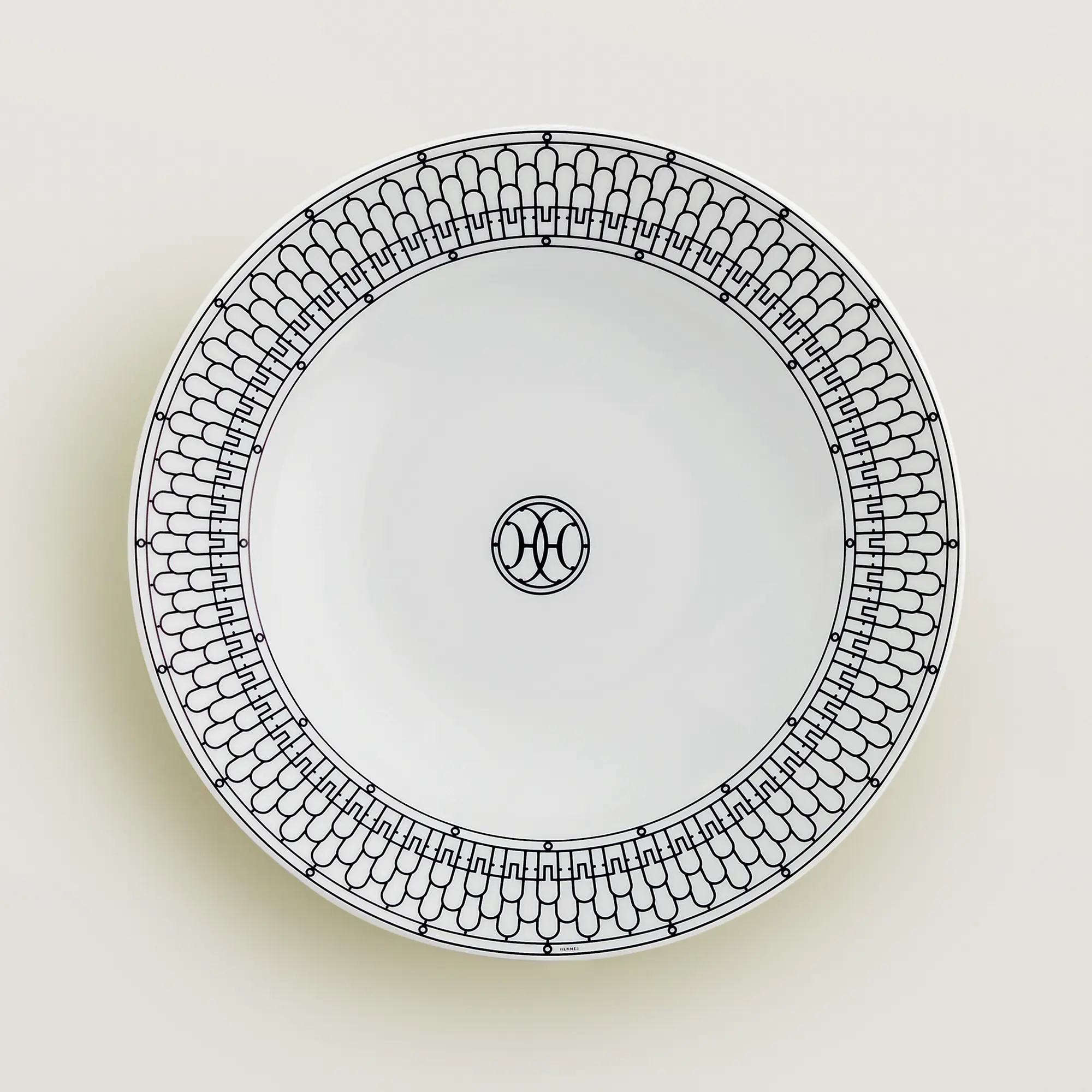 Фарфоровое глубокое блюдо. Коллекция H Déco вдохновлена коваными изделиями в стиле ар-деко, характерными для парижских бутиков Hermès. Сервиз украшен двойной монограммой H, вокруг которой разворачивается изящный узор. Сделано во Франции. Дизайн: Бенуа Пьер Эмер.