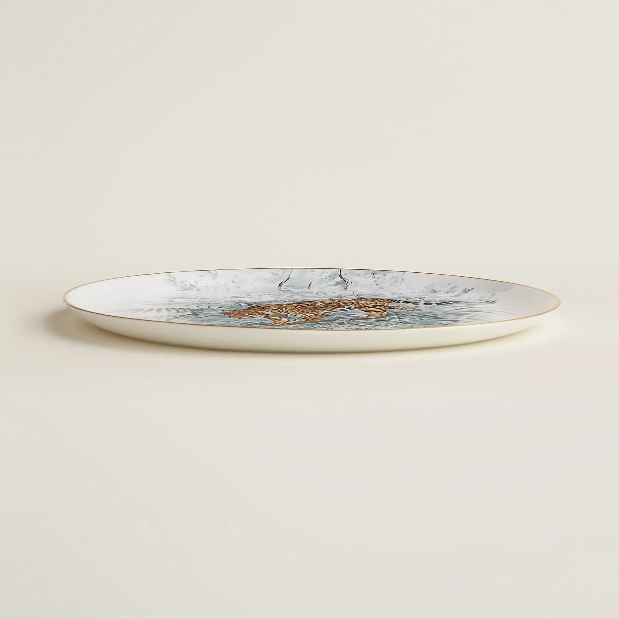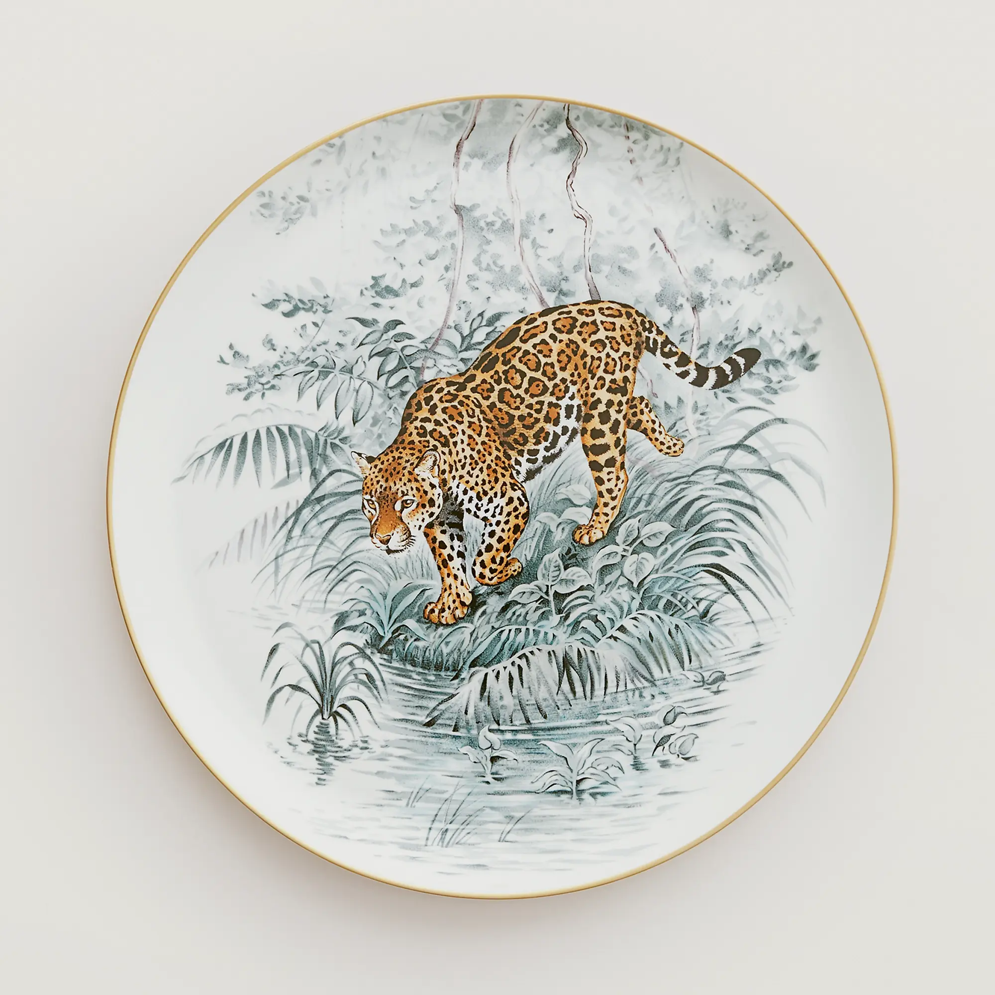 Фарфоровое блюдо с рисунком «Пантера». Рисунки выполнены методом трафаретной печати и нанесены вручную. Золотая кайма обработана вручную. Живая и умиротворяющая природа, воспевающая красоту животных, украшает коллекцию Carnets d'Équateur, созданную художником-натуралистом Робертом Далле. Сделано во Франции.