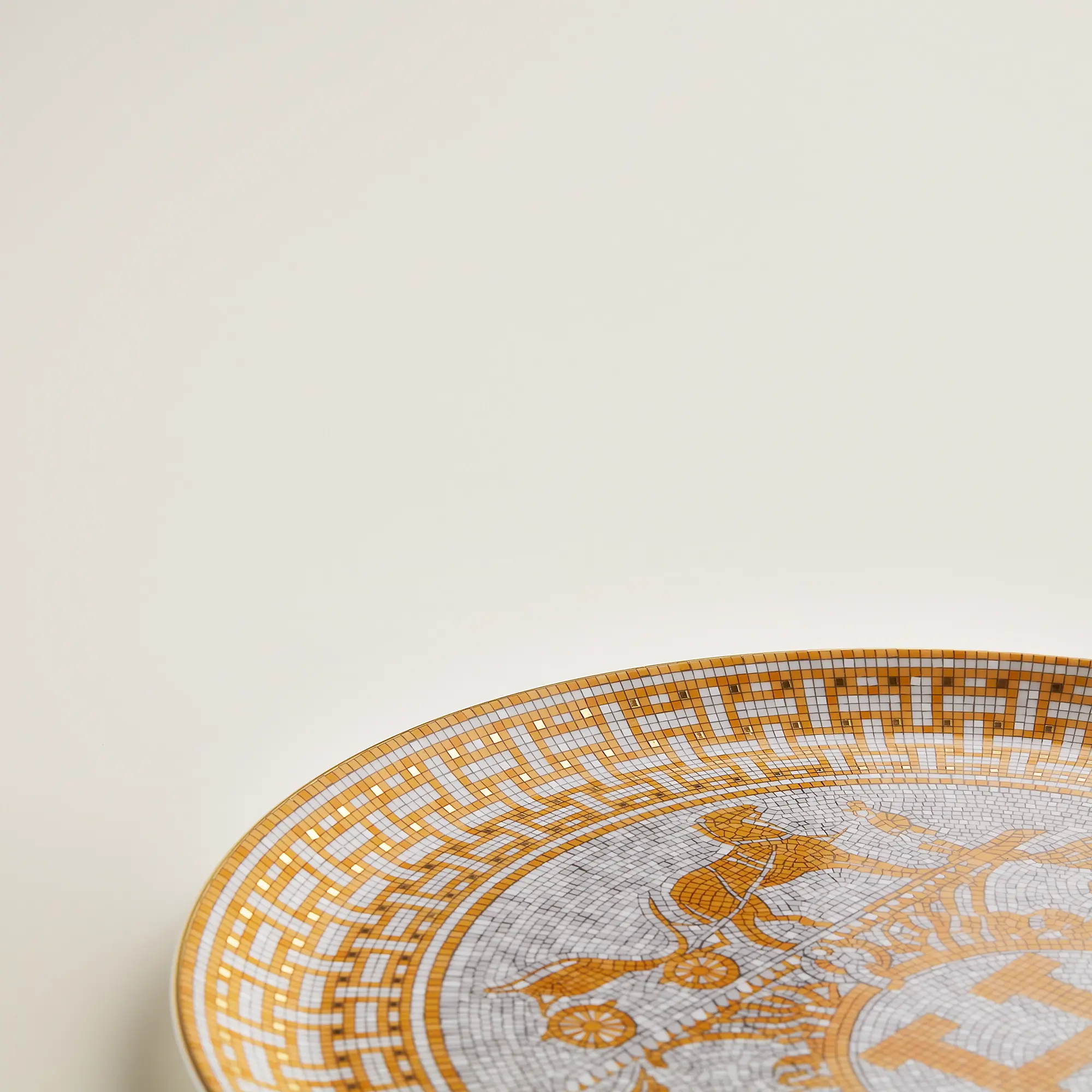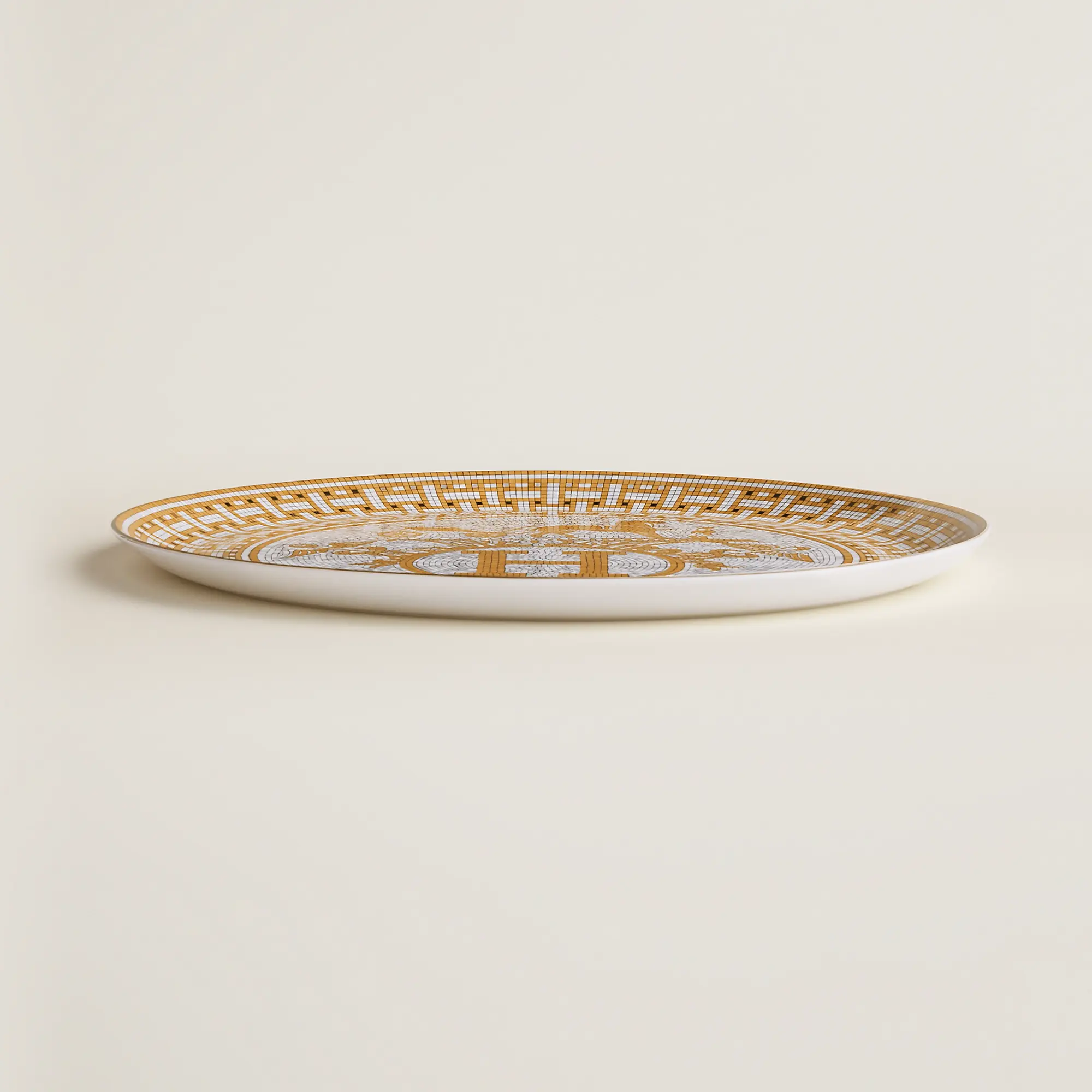 Фарфоровое блюдо. Декор выполнен вручную методом трафаретной печати с золотым покрытием. В коллекции Mosaïque 24 gold использованы геометрические фризы, воспроизводящие оригинальные дизайнерские коды магазина по адресу Фобур Сент-Оноре, 24 в Париже. Сделано во Франции. Дизайн Бенуа Пьера Эмери.
