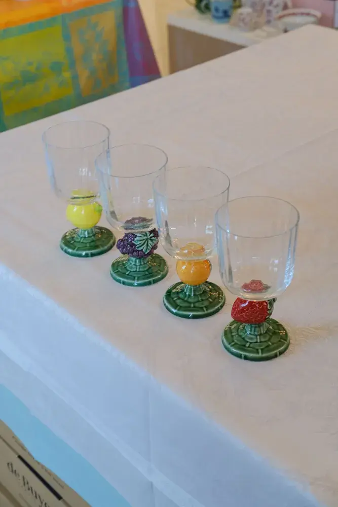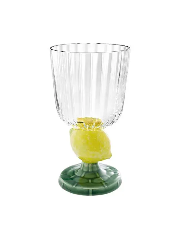 «Carmen» от — это яркая коллекция посуды для напитков, украшенная четырьмя фруктами: красной клубникой, фиолетовым виноградом, жёлтым лимоном и оранжевым апельсином. Бокал имеет керамическую ножку зелёного цвета с фруктами и рифленую чашу из выдувного стекла ручной работы.
