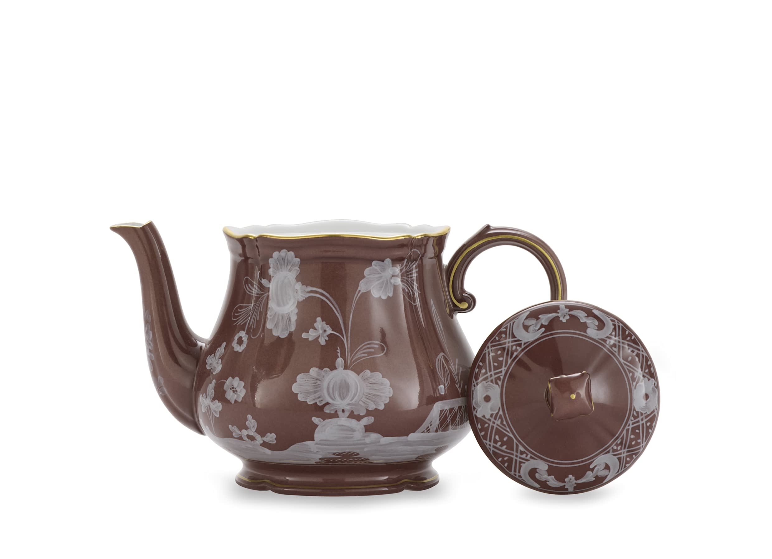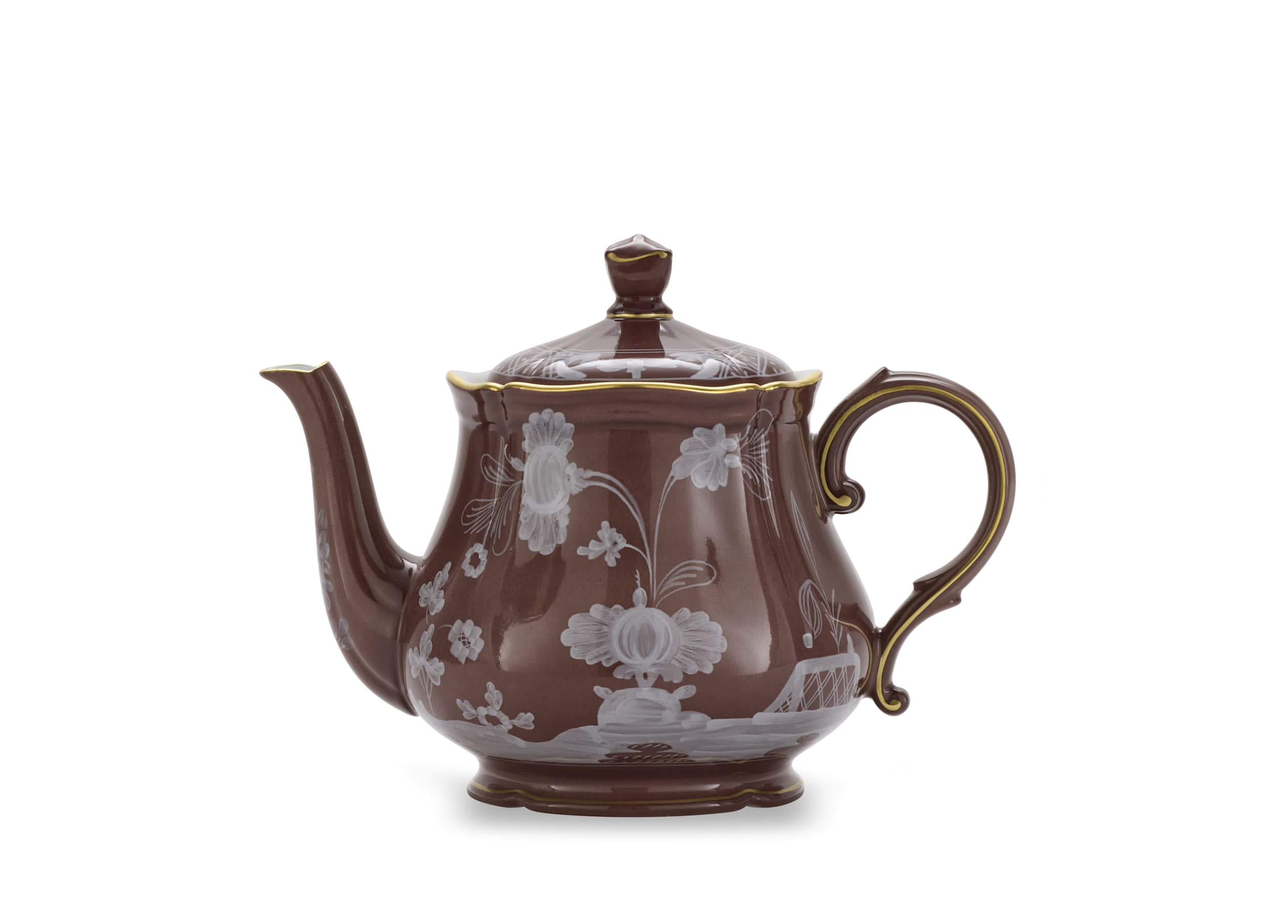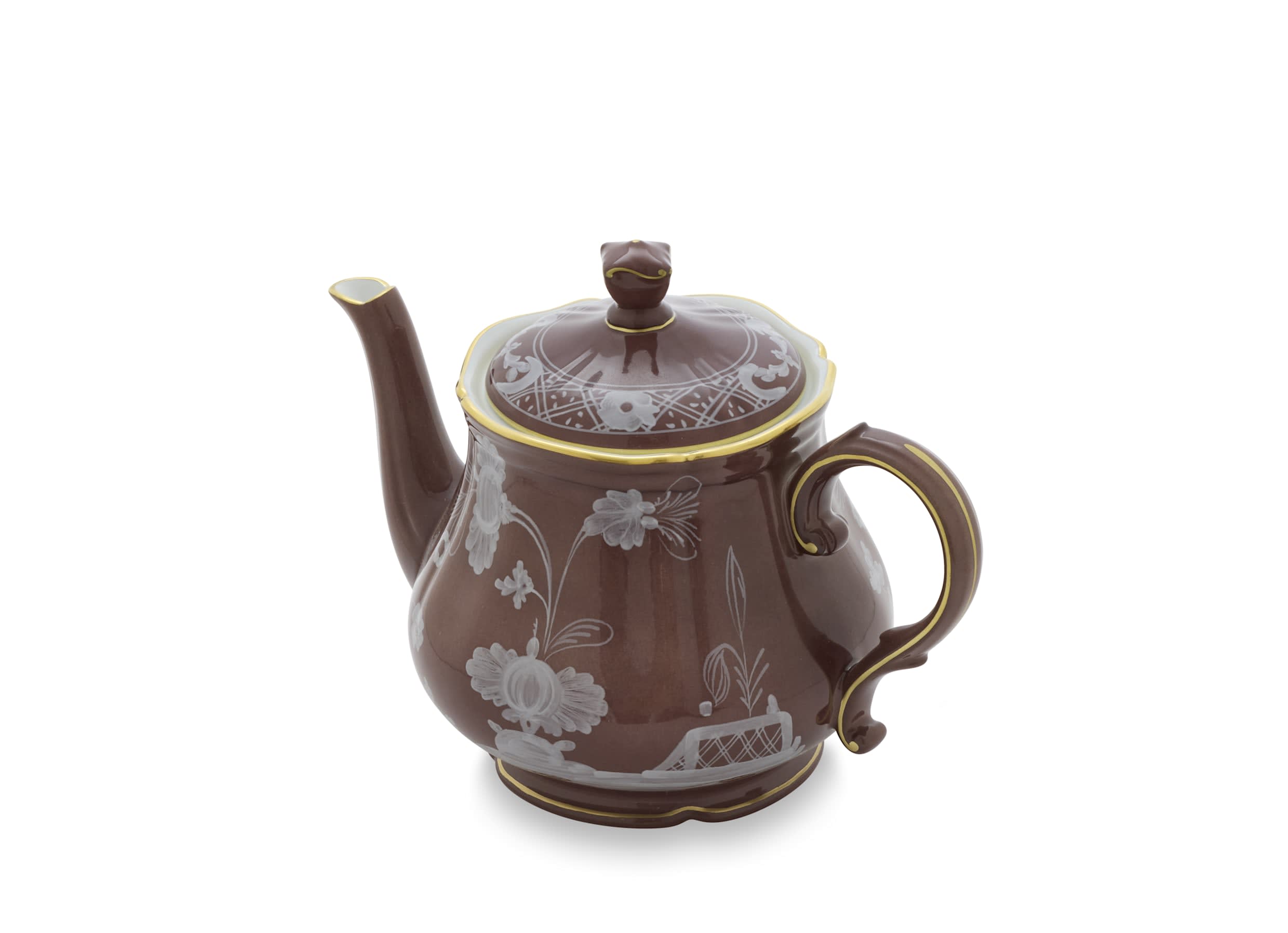 Фарфоровый чайник с декором «Кастанья» и золотой нитью. Коллекция Oriente Italiano. Коричневый оттенок «Кастанья», украшенный культовой золотой нитью, придает фарфоровому чайнику вневременную привлекательность, идеально подходящую для тех, кто ценит красоту традиций.