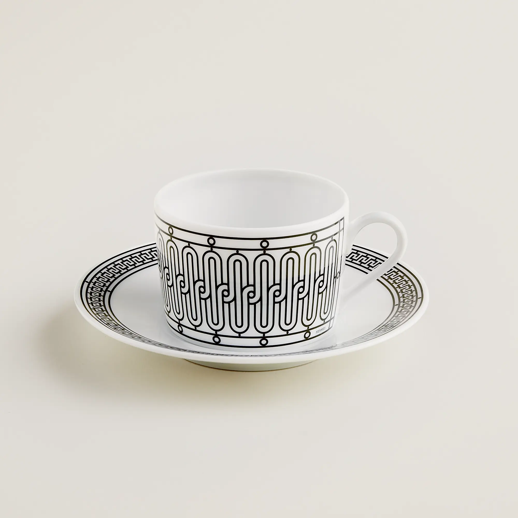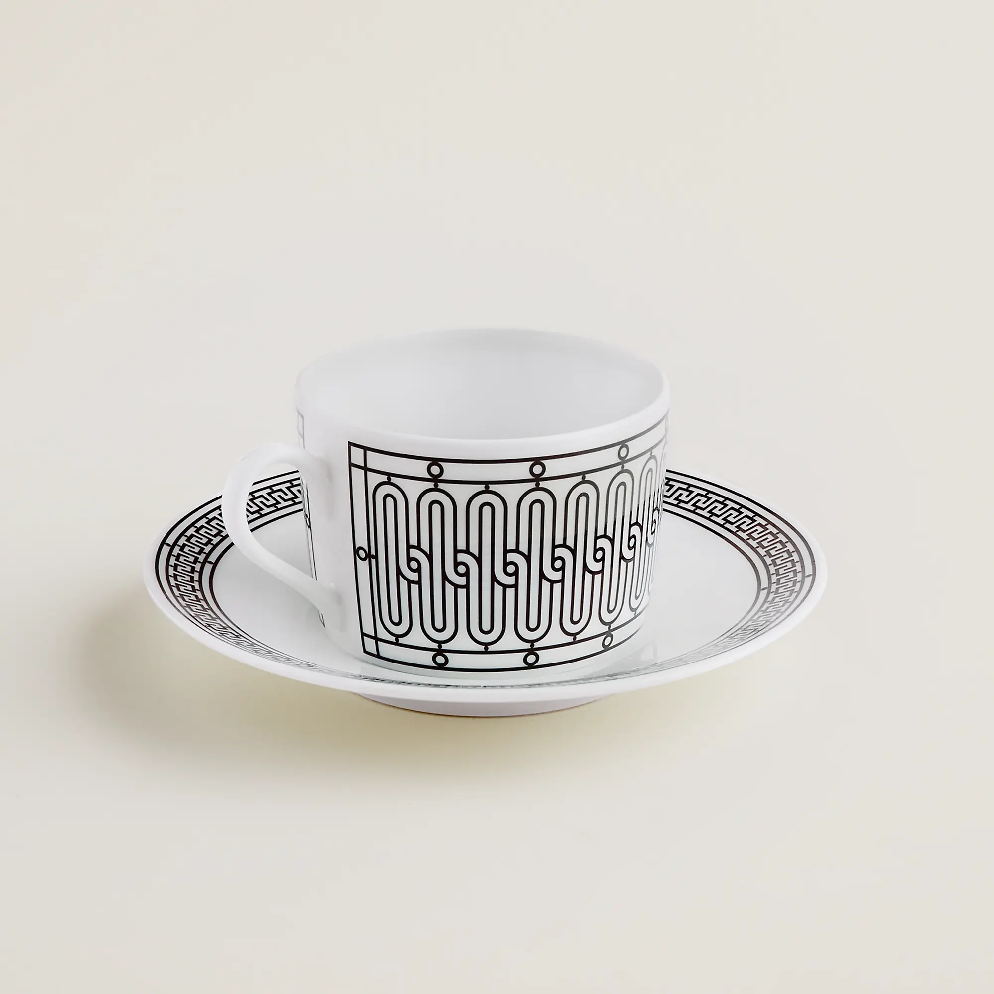 Набор из фарфоровых чайных чашек с блюдцем (2 шт). Коллекция H Déco вдохновлена коваными изделиями в стиле ар-деко, характерными для парижских бутиков Hermès. Сервиз украшен двойной монограммой H, вокруг которой разворачивается изящный узор. Сделано во Франции. Дизайн: Бенуа Пьер Эмер.