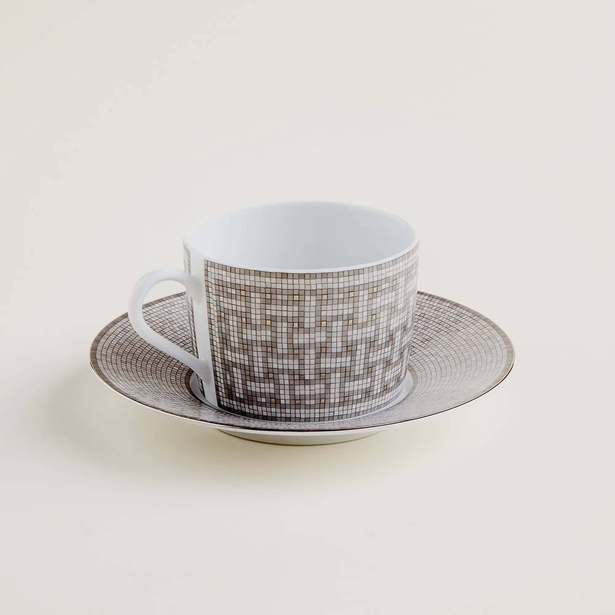 Набор из двух фарфоровых чашек с блюдцем. Декор выполнен вручную методом трафаретной печати с платиновым покрытием. Коллекция Mosaïque au 24 Platinum, созданная Бенуа Пьером Эмери, с её геометрическими фризами, переосмысливает оригинальный декор дома 24 по улице Фобур Сент-Оноре в Париже. Сделано во Франции. Дизайн Бенуа Пьера Эмери.