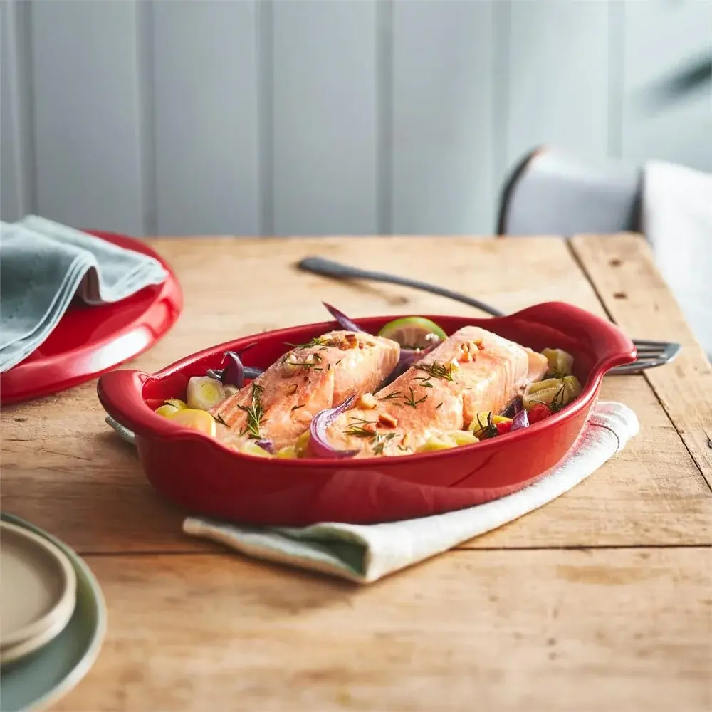 Положите филе или рыбу в центр блюда, разложите вокруг него овощи и зелень, приправьте. Закройте крышку и поставьте в горячую духовку. Вынув блюдо из духовки, дайте ему несколько минут отдохнуть перед подачей; крышка хорошо сохраняет тепло. Вам остаётся только поставить «Плат Папильот» прямо на стол. Снимите крышку, и блюдо готово: горячее и элегантно сервированное.