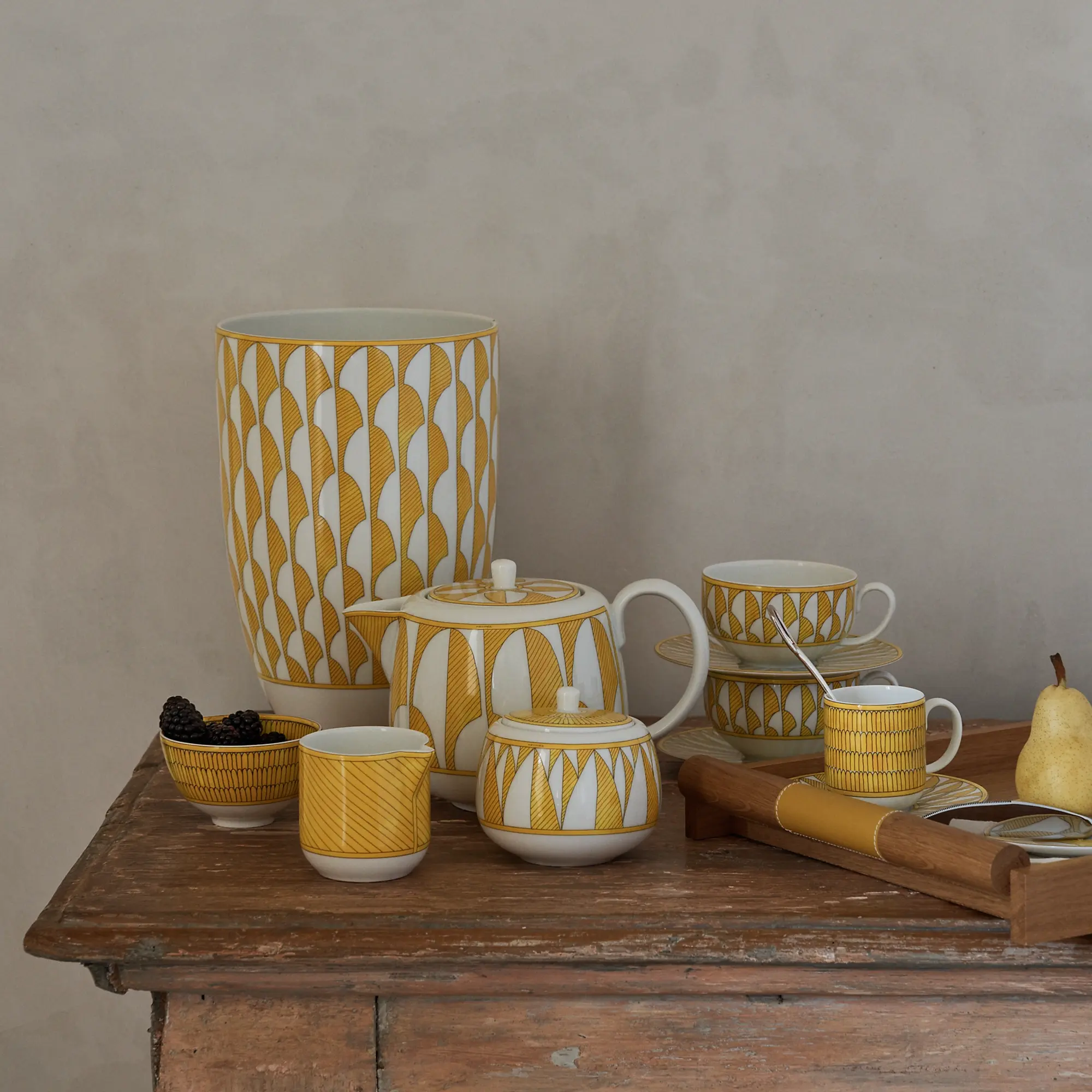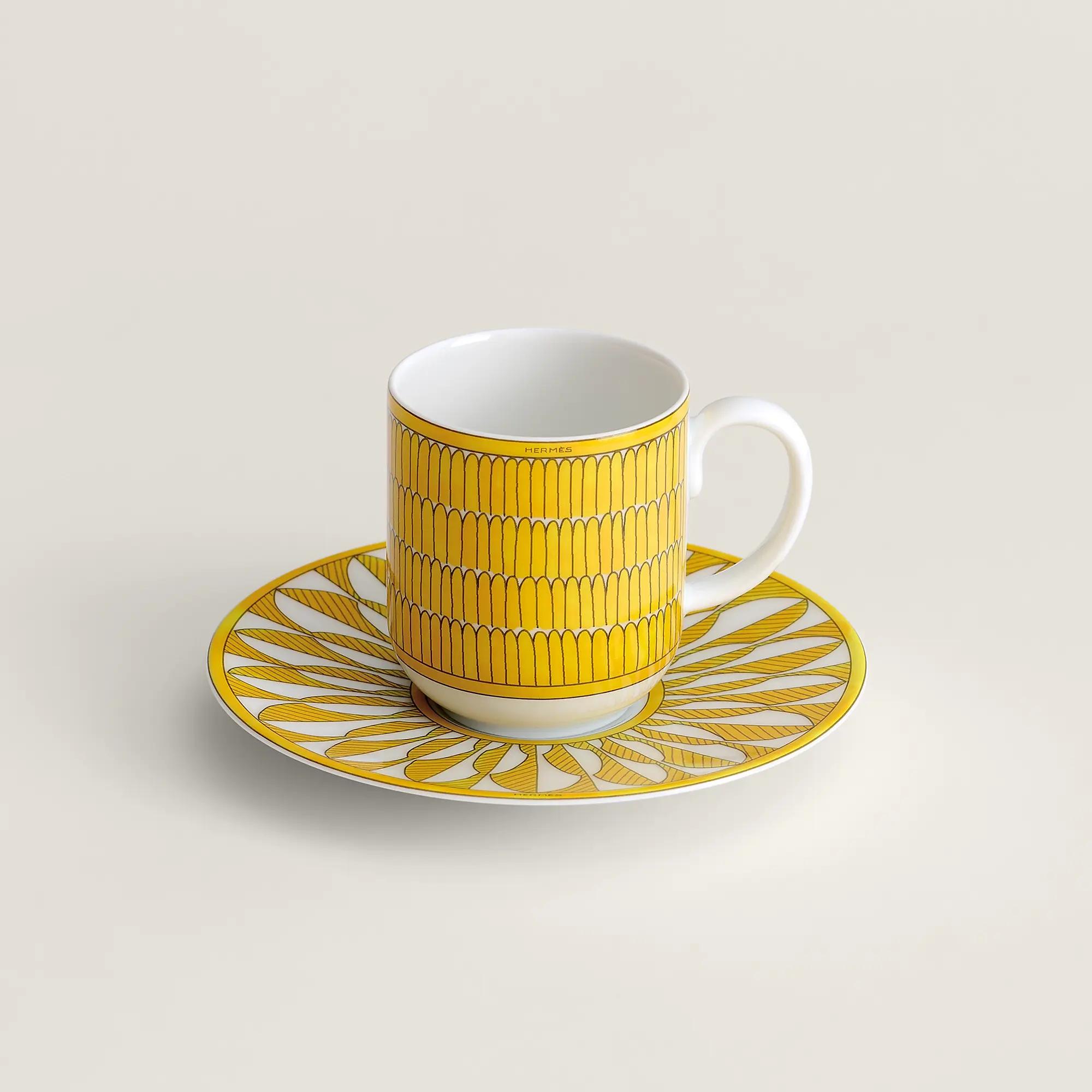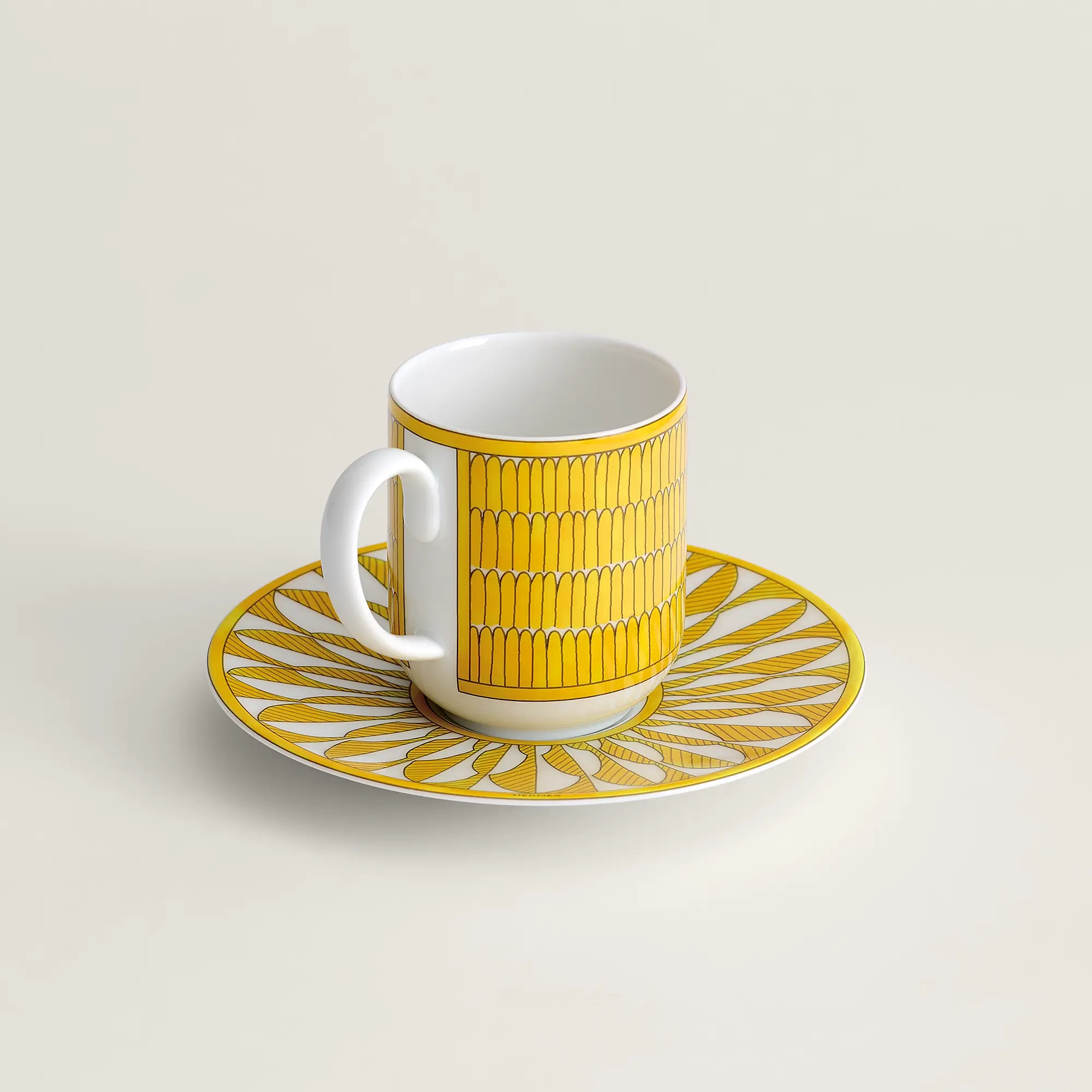 Набор из фарфоровых чайных чашек с блюдцем (2 шт). Коллекция Soleil d'Hermès включает 24 предмета для обеда, ужина, чая/кофе. В ней сочетаются белый цвет фарфора и насыщенный желтый цвет, подчеркнутый изящными линиями, создающими калейдоскопический пальмовый узор. Сделано во Франции. Художник Ариэль де Бришамбо.