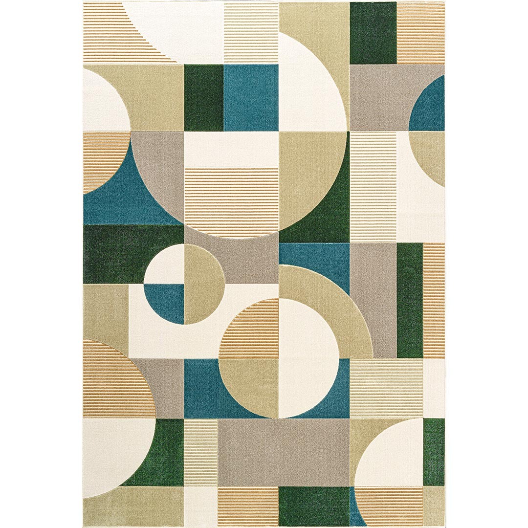 Ковёр VITTORIA 9780017/6242 очаровывает своим ярким геометрическим узором, сочетающим в себе круги, линии и блоки в освежающих оттенках зелёного, бирюзового, кремового и бежевого. Этот современный дизайн привносит яркую энергию и ощущение гармонии в любое пространство, делая его отличным выбором для тех, кто хочет украсить свой интерьер уникальным ковром для спальни или стильным решением для гостиной. Низкий ворс и однородная текстура создают элегантный, современный вид, который подчёркивает чёткость геометрического рисунка и обеспечивает лёгкость в уходе. Такая структура идеально подходит для мест с высокой проходимостью, обеспечивая комфорт и стиль без ущерба для практичности.