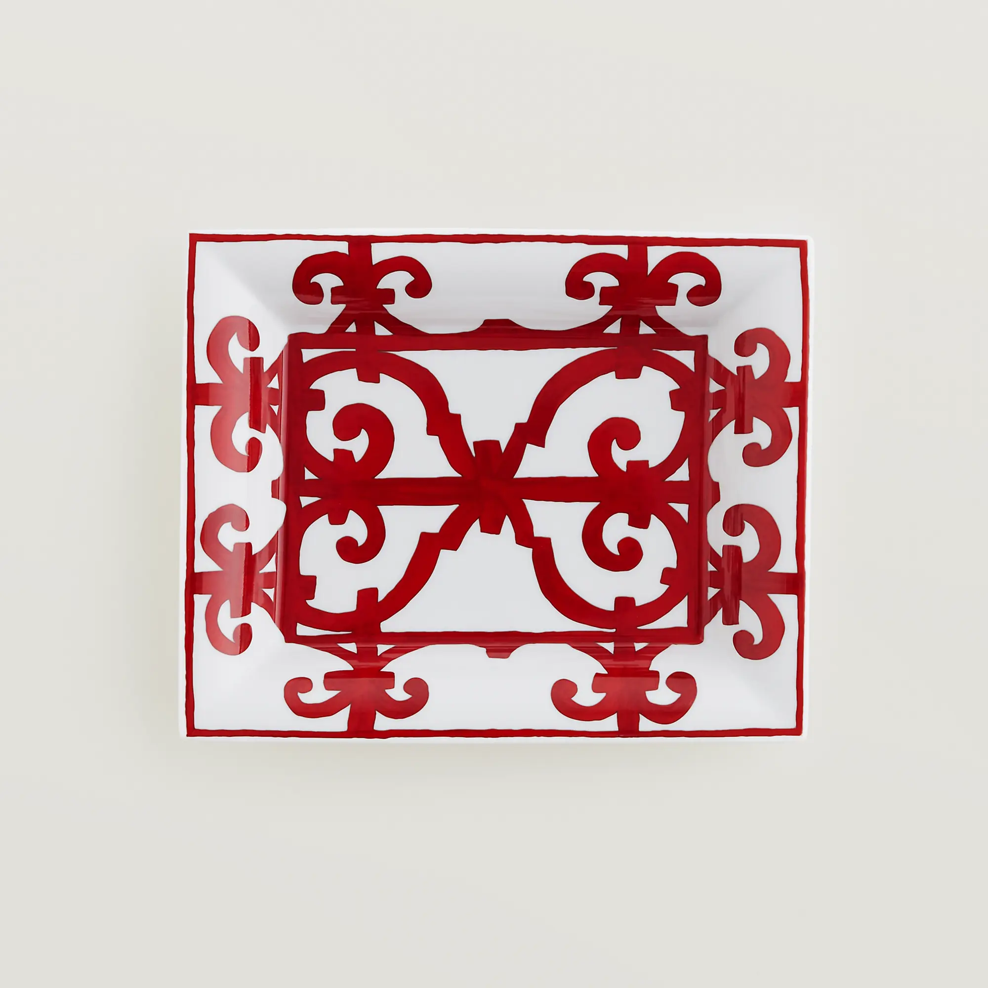 Фарфоровая мелочница. Рисунки выполнены методом трафаретной печати и нанесены вручную. Этот ярко-красный сервиз, состоящий из 47 предметов, идеально подходит для обеда, ужина, чая/кофе или в качестве декоративных элементов. Он отдает дань уважения смелым дизайнерским решениям андалузской кузницы. Сделано во Франции. Художник Ариэль де Бришамбо.
