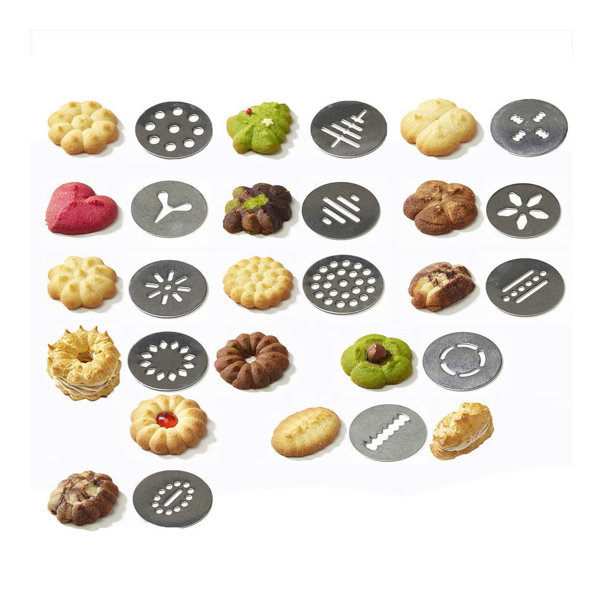 Поставляется со специальным набором для песочного печенья, состоящим из 2 простых крышек, специальной крышки (держателя дисков) и 13 съёмных декоративных дисков для приготовления разнообразных и оригинальных песочных и заварных изделий.