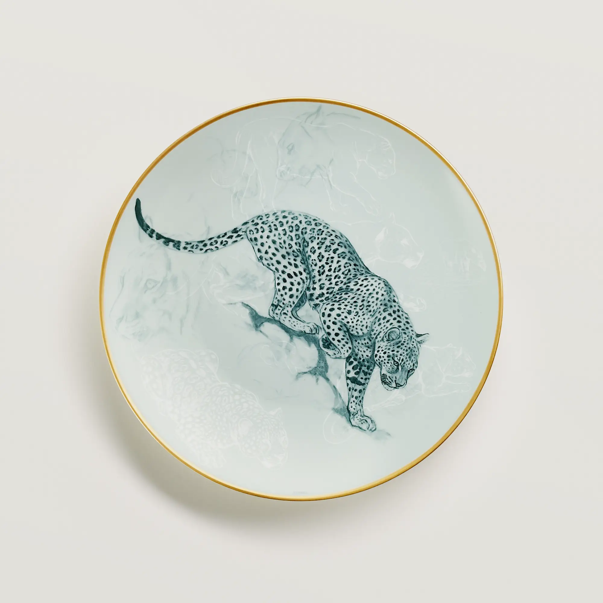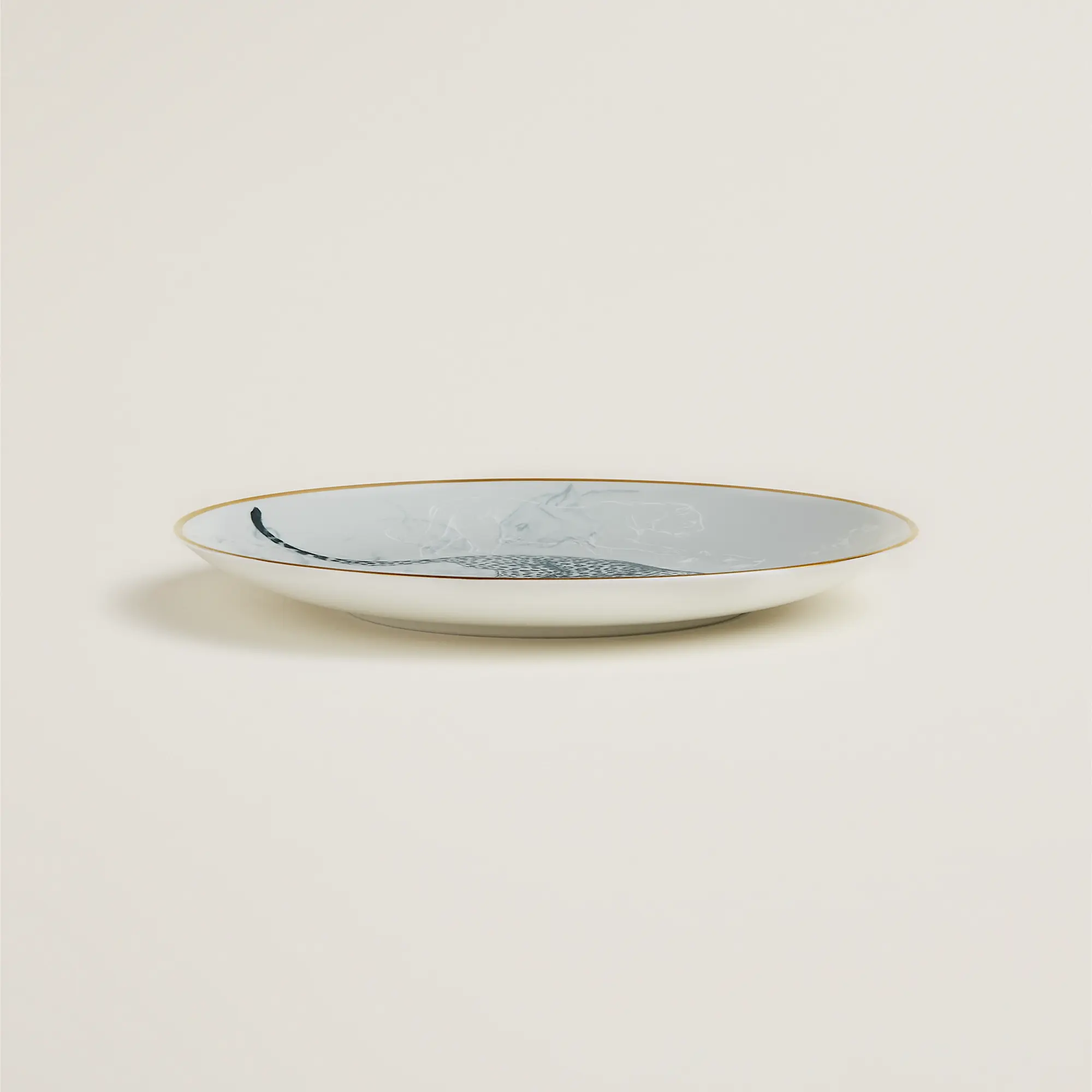 Фарфоровая десертная тарелка с рисунком «Пантера». Рисунки выполнены методом трафаретной печати и нанесены вручную. Золотая кайма обработана вручную. Живая и умиротворяющая природа, воспевающая красоту животных, украшает коллекцию Carnets d'Équateur, созданную художником-натуралистом Робертом Далле. Сделано во Франции.