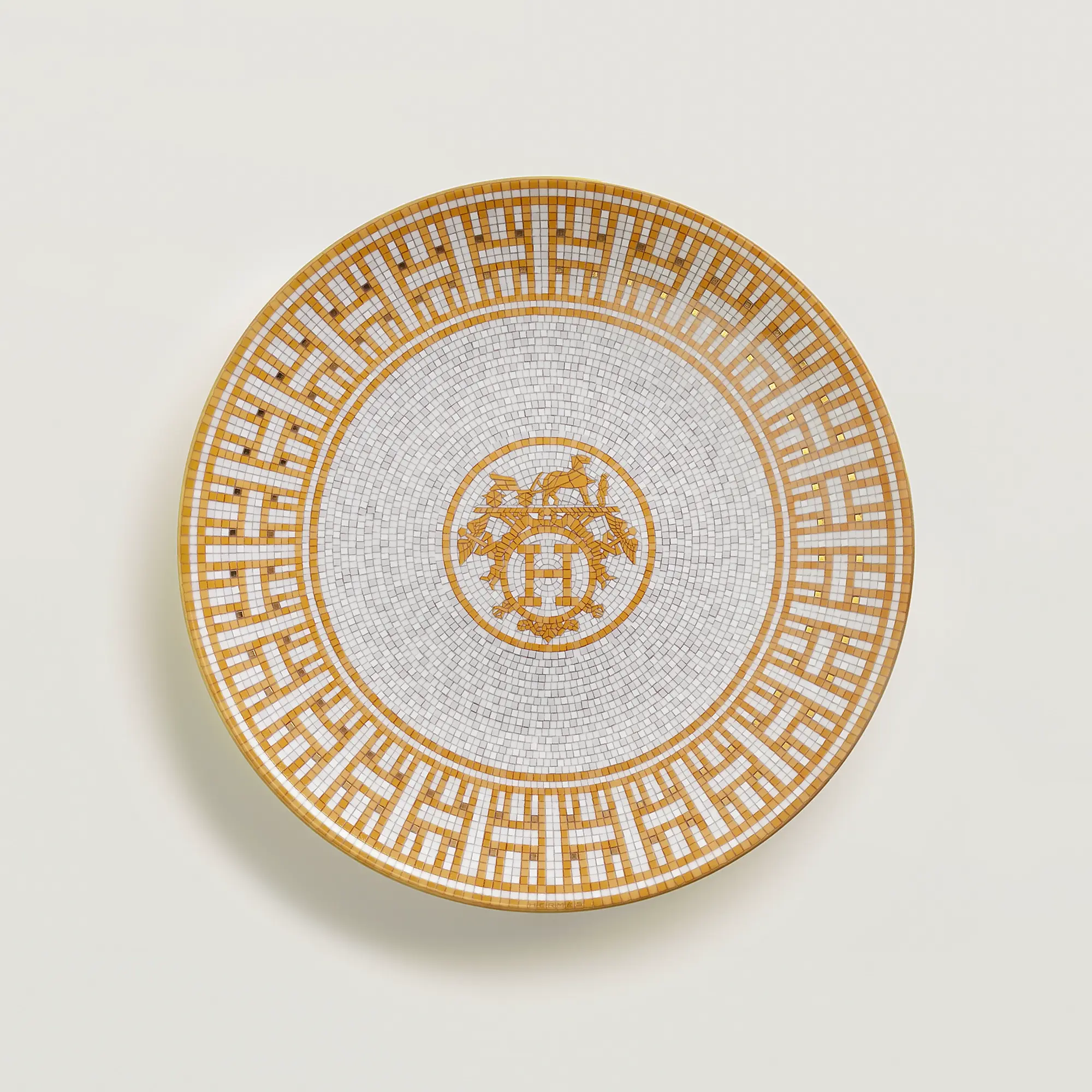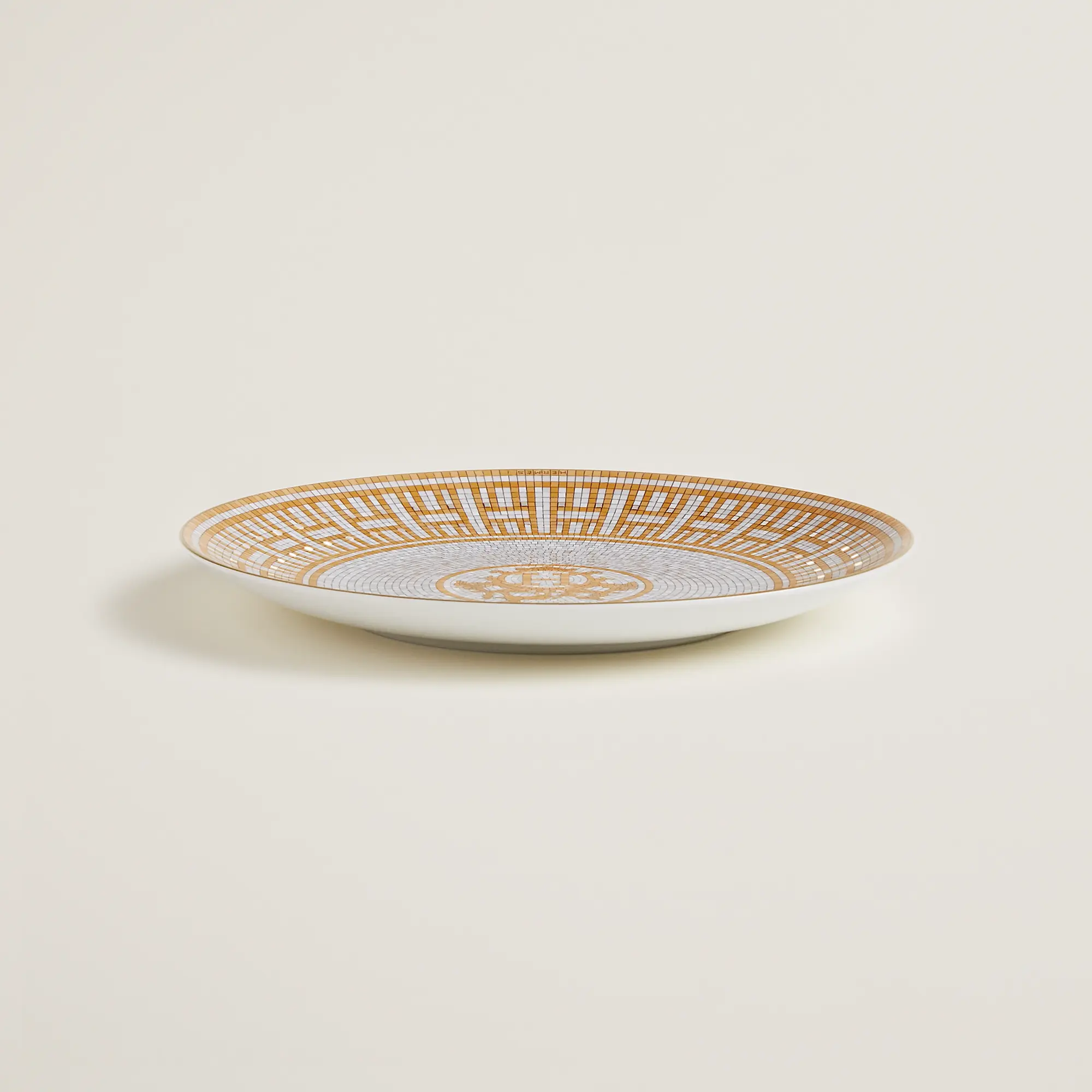 Фарфоровая десертная тарелка. Декор выполнен вручную методом трафаретной печати с золотым покрытием. В коллекции Mosaïque 24 gold использованы геометрические фризы, воспроизводящие оригинальные дизайнерские коды магазина по адресу Фобур Сент-Оноре, 24 в Париже. Сделано во Франции. Дизайн Бенуа Пьера Эмери.