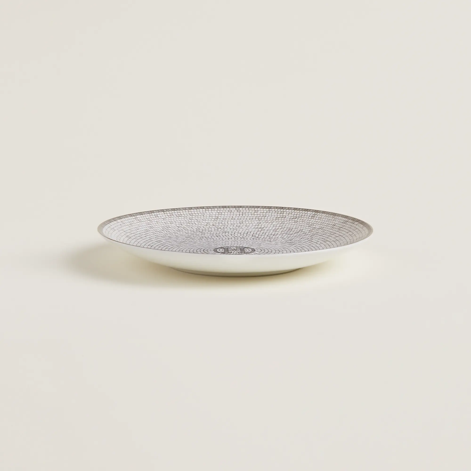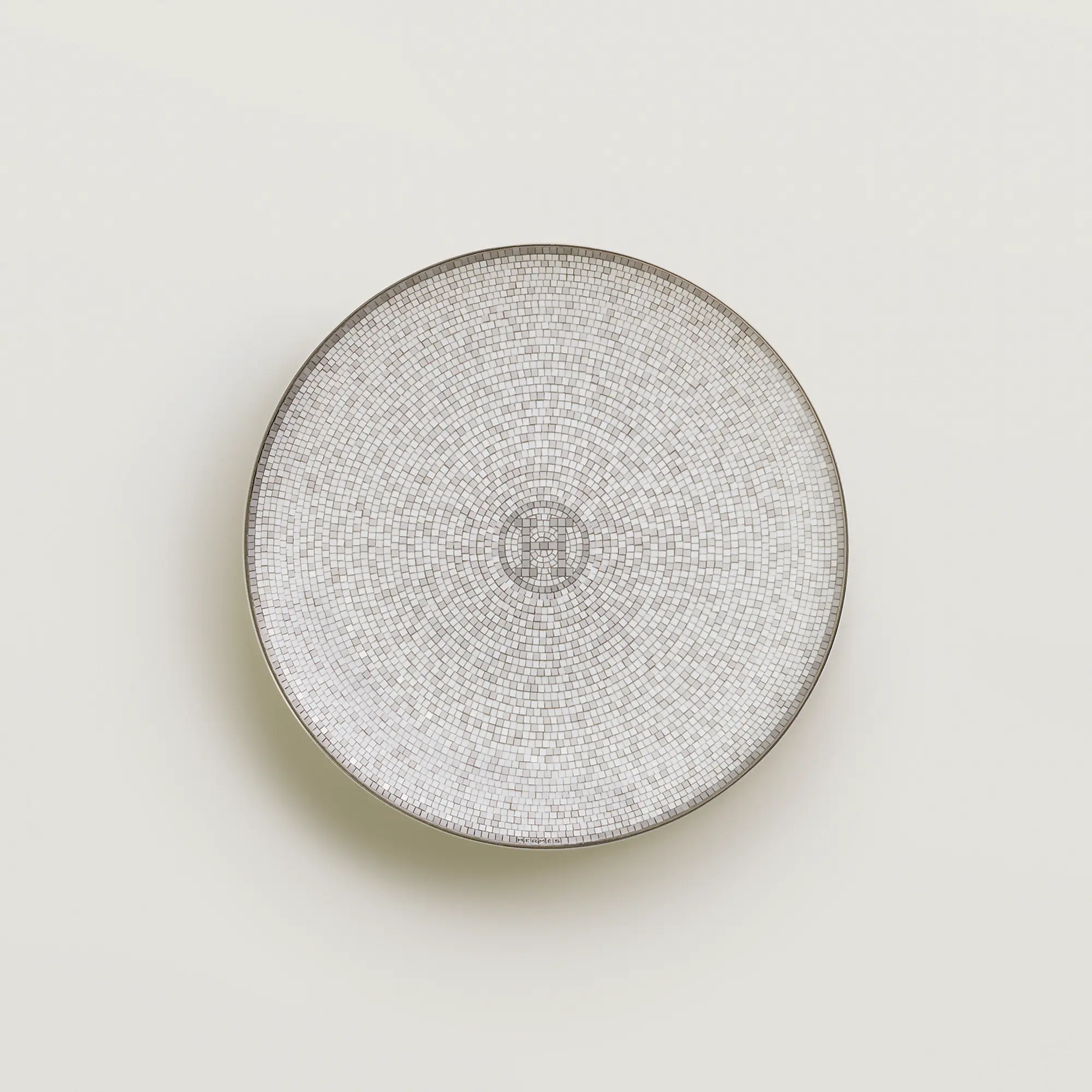 Фарфоровая тарелка для хлеба. Декор выполнен вручную методом трафаретной печати с платиновым покрытием. Коллекция Mosaïque au 24 Platinum, созданная Бенуа Пьером Эмери, с её геометрическими фризами, переосмысливает оригинальный декор дома 24 по улице Фобур Сент-Оноре в Париже. Сделано во Франции. Дизайн Бенуа Пьера Эмери.
