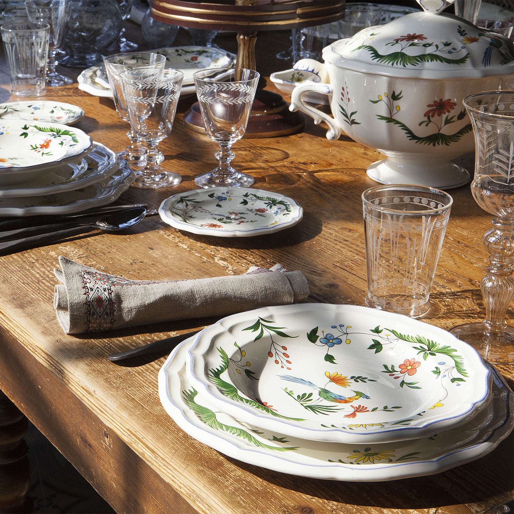 Эти обеденные тарелки идеально подойдут как для неформальных встреч, так и для повседневных обедов, украсят ваш стол и будут сопровождать вас на протяжении всего кулинарного процесса с элегантностью. Благодаря изящным краям, нанесенным вручную, обеденные тарелки Oiseaux de Paradis прекрасно дополнят коллекцию Filet Bleu.