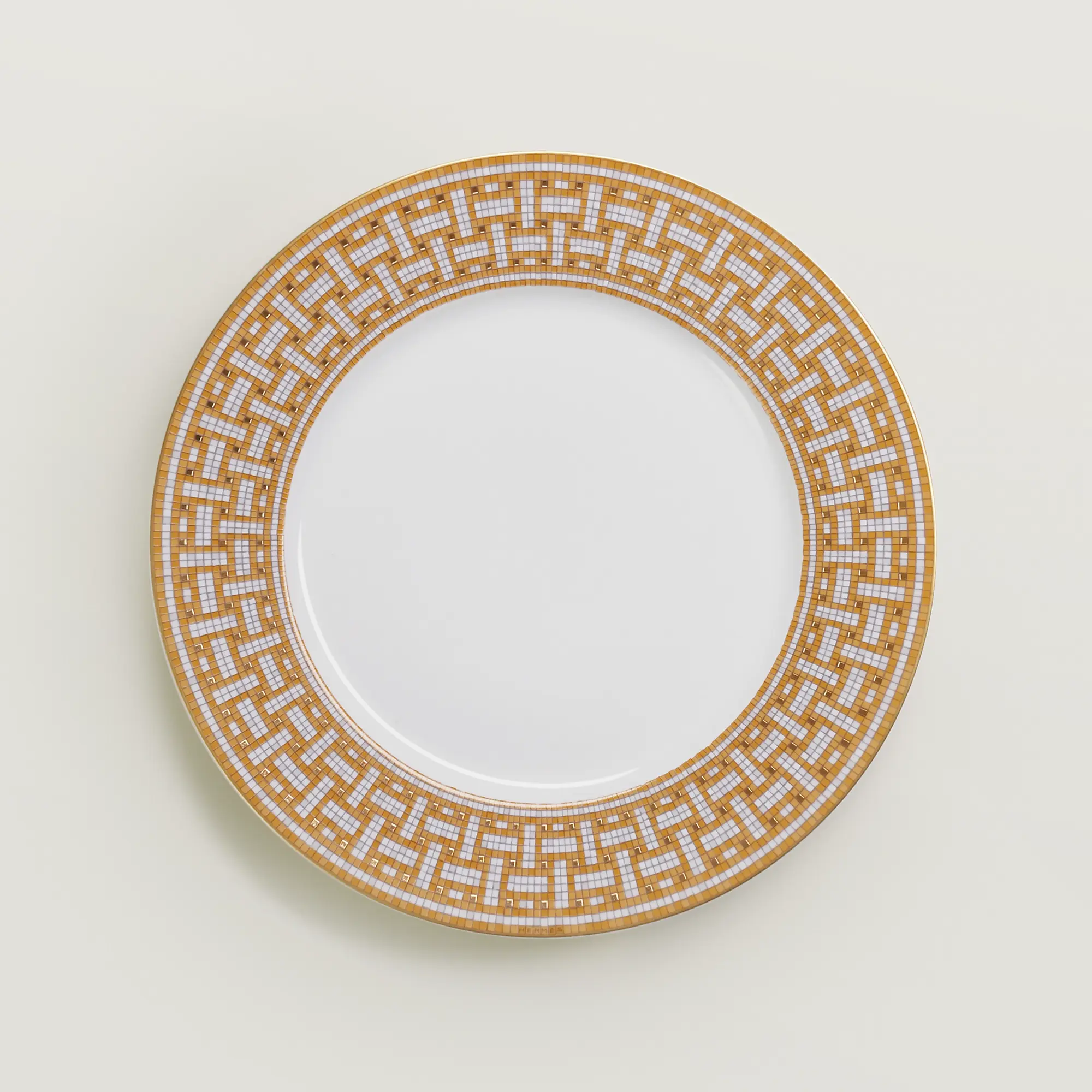 Фарфоровая обеденная тарелка. Декор выполнен вручную методом трафаретной печати с золотым покрытием. В коллекции Mosaïque 24 gold использованы геометрические фризы, воспроизводящие оригинальные дизайнерские коды магазина по адресу Фобур Сент-Оноре, 24 в Париже. Сделано во Франции. Дизайн Бенуа Пьера Эмери.