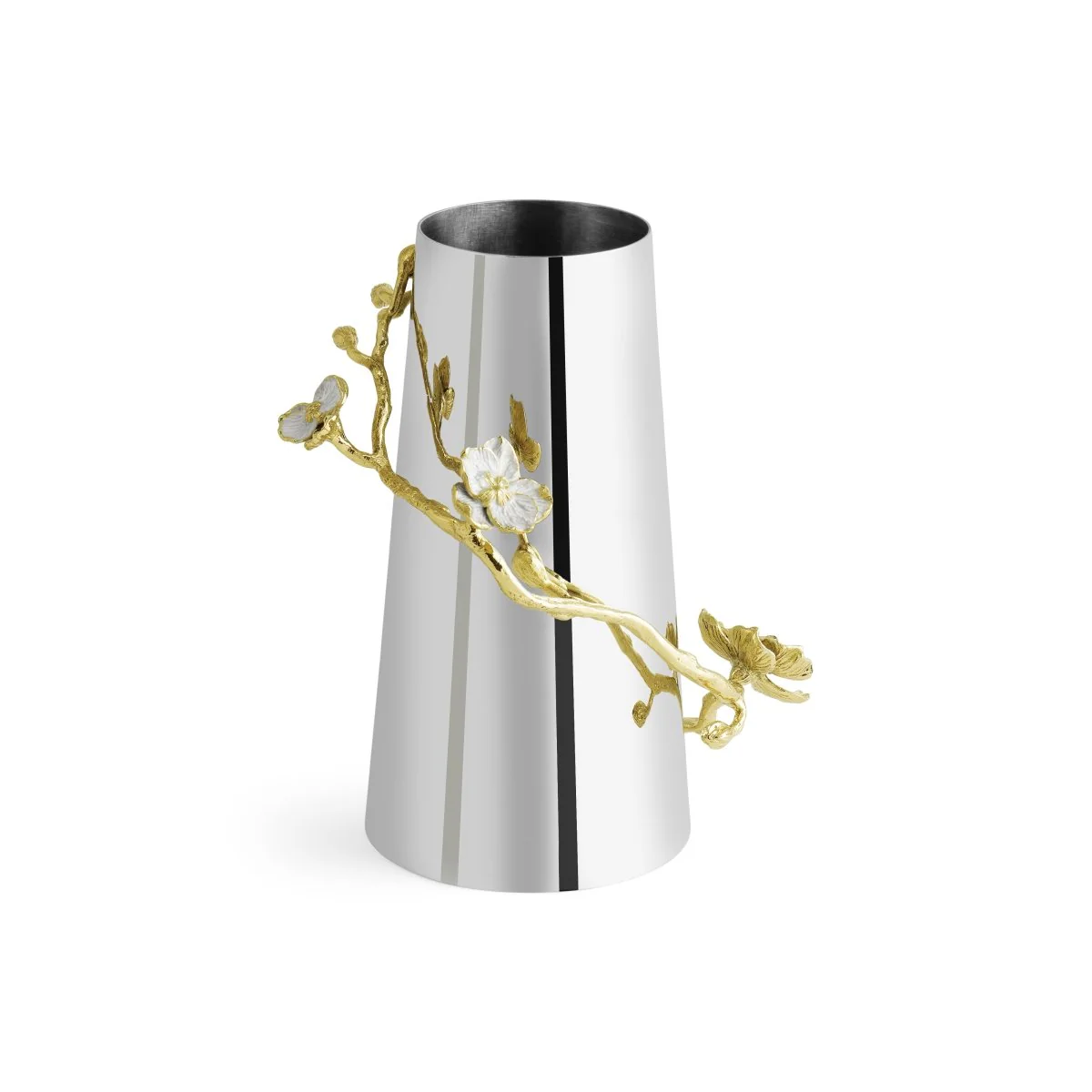 Ваза «Орхидея» — это потрясающее произведение искусства ручной работы, изготовленное из натуральной латуни и нержавеющей стали, украшенное нежными белыми эмалированными орхидеями. Воспевающая чистоту и изящество, ее элегантный дизайн сочетает в себе яркие детали и вневременную роскошь. Эта изысканная ваза украсит любое пространство своей неземной красотой и утонченным мастерством.
